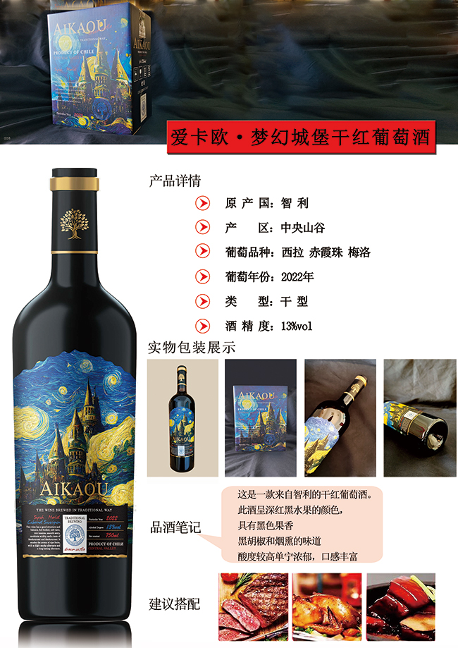 【產(chǎn)品名稱】愛(ài)卡歐·夢(mèng)幻城堡干紅葡萄酒【13°750ml】